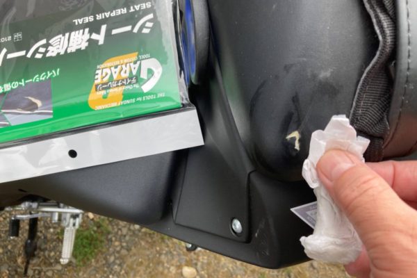 シート補修シールの裏紙を剥がして傷を隠すように貼り付けて、指を使って押し付けたりこすったりしましょう。