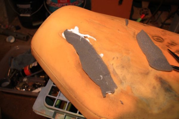 破れただけなら新しいシートをかぶせてしまえばOKなのですが、今回はスポンジがえぐれてしまっていますので補修が必要です。