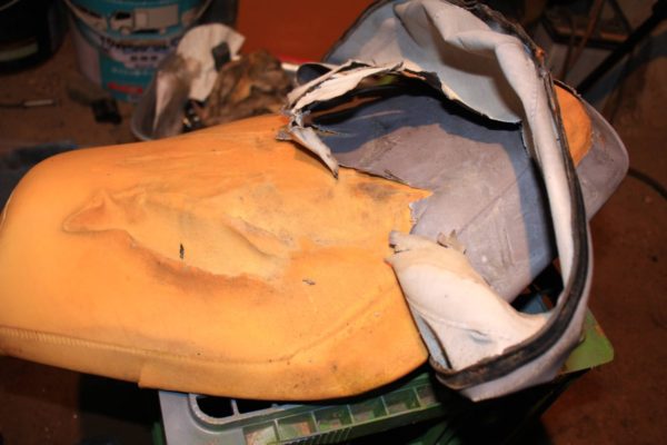 破れているだけならまだしも、中のスポンジまで劣化してヘコんでしまっています。廃車置き場の部品取りだったこのマシン。長年野ざらしになっていたので仕方ないですね。