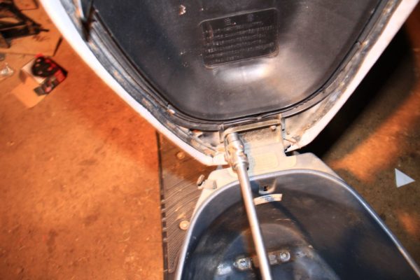 まずはシートを車体から取り外しましょう。スーパーディオの場合、シート付け根のネジを外せばOKです。