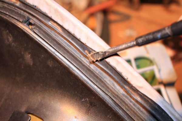 シートが外れたらひっくり返してタッカーの針をマイナスドライバーを使って外して行きます。