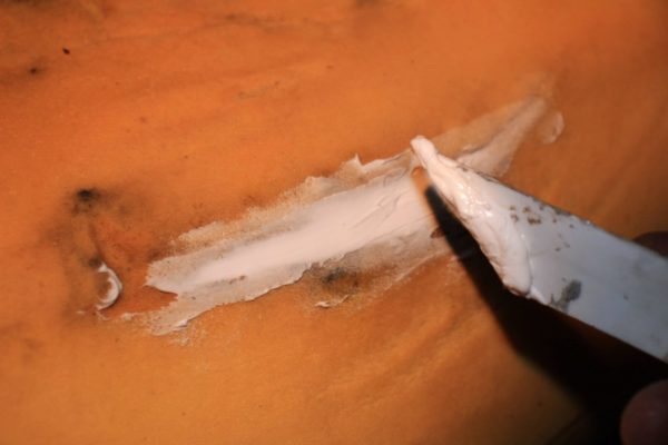 シートのスポンジが傷んでヘコんでいたらシール剤で修正します。
