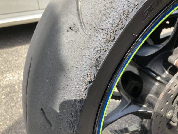 サーキット走行をしているというWさんのマシン。タイヤはご覧の通り消しゴムカス状態でドロドロ。