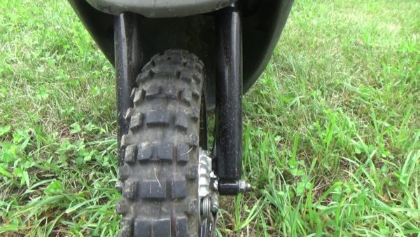 このマシンの泥対策として、細身のIRC-IX07s(2.50-10)を履くことによってフォークとの隙間が広く取れる様にしています。