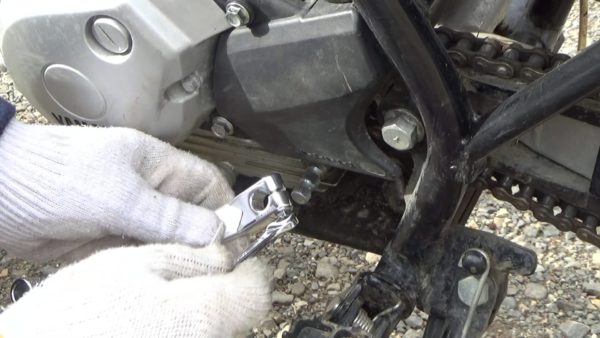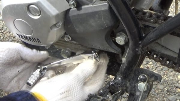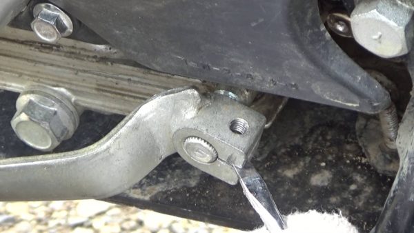 新しいチェンジペダルのボルトを外します。こちらは8mmのスパナです。緩んだらボルトは一旦抜いてしまいましょう。