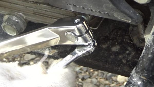 まずは純正品を外しましょう。10mmのスパナかボックスレンチを使ってボルトを緩めます。