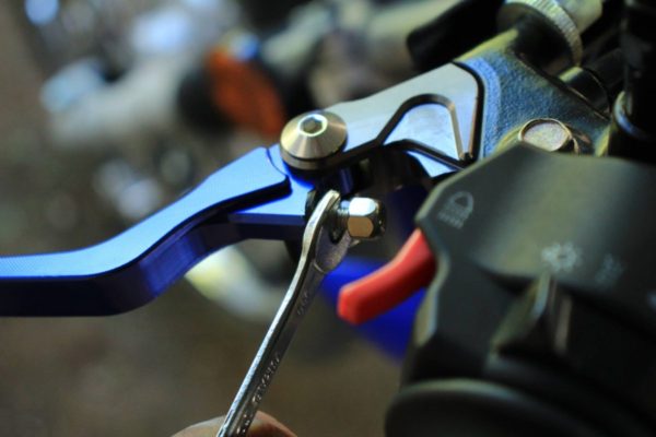 新しいレバーにワイヤーの玉をセットして穴を合わせてボルトを入れて締めます。裏側からナットを締めてクラッチレバーの交換は終了です。