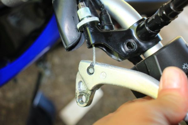 まずはクラッチ側から行いましょう。クラッチレバーを思いっきり握った状態で木の棒か工具を挟んでクラッチが戻らない様にします。