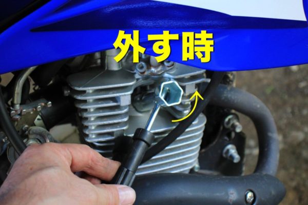 車載工具(左サイドカウルを外すとバッテリーがあって、その後ろに黒い袋に入っています。)の袋の中にプラグレンチがありますので、ドライバーを穴に挿して細い方の六角形を点火プラグにかぶせて回します。