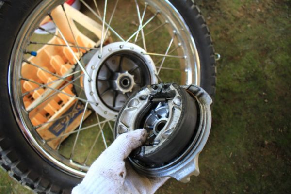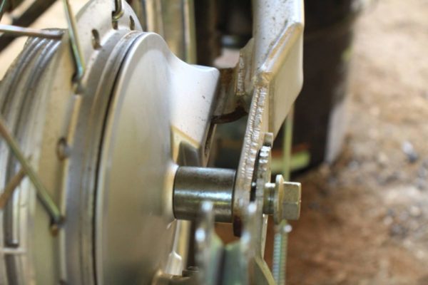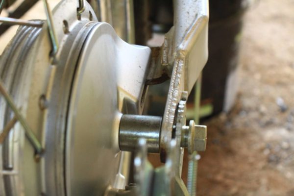タイヤを持ち上げてからブレーキドラムをスイングアームの金具に合わせて押し込みつつ、アクスルシャフトを差し込みます。
