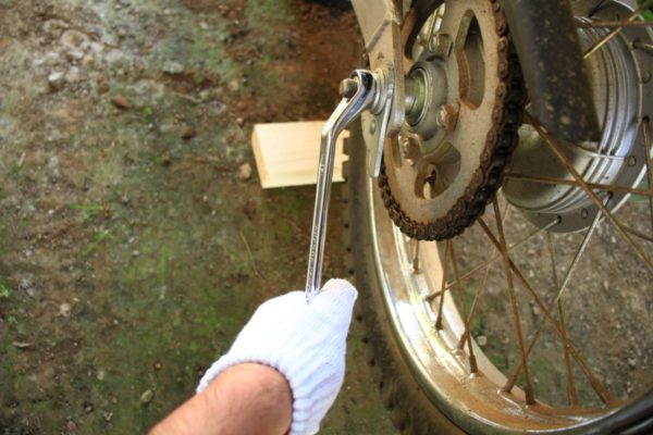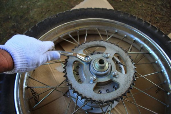 では、新しいドリブンスプロケットをはめてからナットロックの平べったい金具を戻し、メガネレンチを使ってナットを締め付けます。