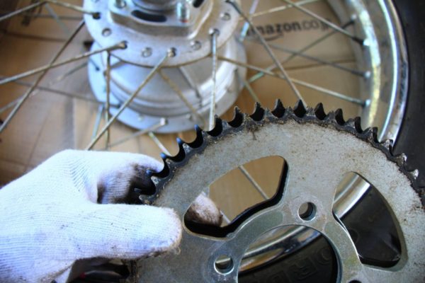 先日フロント(ドライブ)スプロケットを標準の14Tから13Tに落としたところ林道を走るのにだいぶマシになりました。チェーンにも余裕ができましたのでドリブンスプロケットも交換することにしました。