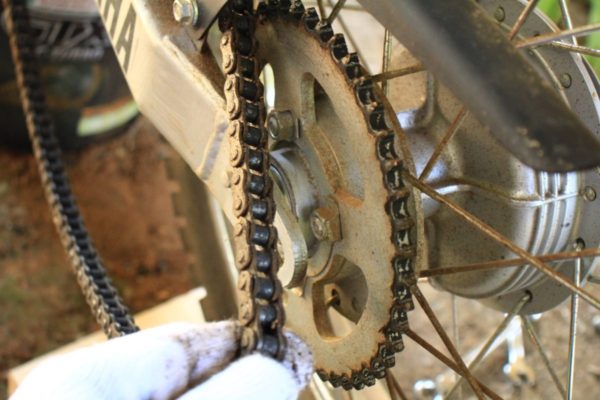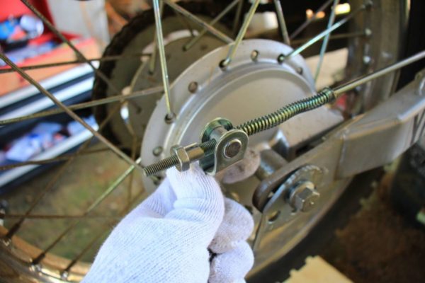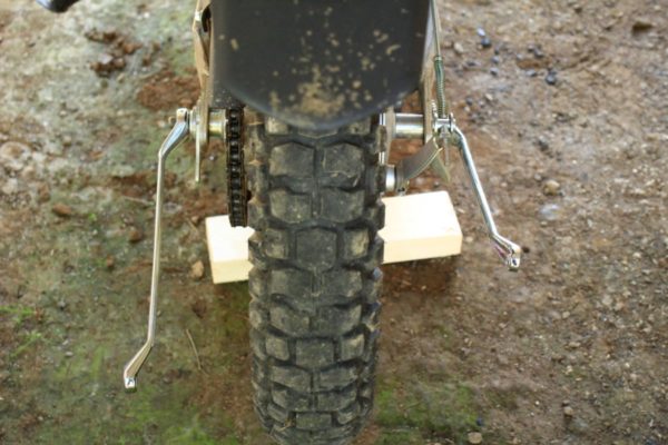 左右で同じ位置になる様に注意して調整しましょう。オフロード車なのでちょっと緩いかな?と思う程度で充分です。サスが思いっきり沈んだ時にチェーンが張りすぎてしまうからです。
