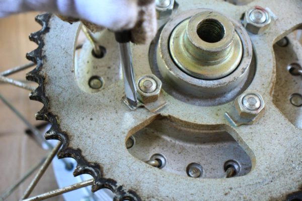 スプロケットのナットのところを見ると、平べったい金具を起こしてナットが緩まないように固定してあります。