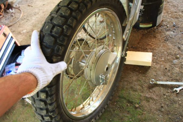 タイヤの下に何かを入れて持ち上げておくと楽です。私は木の角材を使いましたが、もう一人呼んで来てタイヤを持ってもらうと楽でしょう。