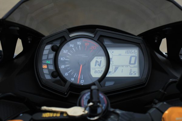 ハイテク満載のバイクなのでメーターも表示がいっぱいです。そんな中でもタコメーターを針で残してくれたのは良いですね。